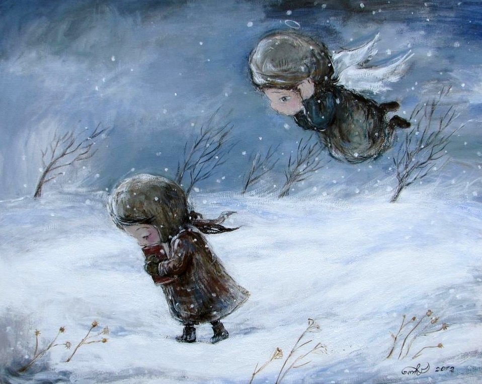 Мой ангел горбат и уродлив. На коленках синяки, на губах смиренная улыбка. Ростом не больше метра с нимбом, а руки длинные как жерди. Он нервно кашляет, извещая о своём приходе, шаркает прохудившимися ботинками по палате и тычет меня в спину худым пальцем.