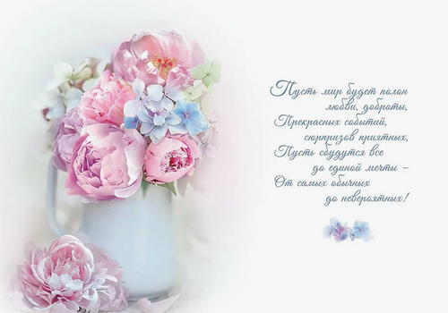 Расцветает пусть в День рождения Дом букетами цветов, Станет светлым настроение От сердечных, добрых слов! Пусть душа поверит в чудо, Сбудутся желанья вновь, А в счастливом сердце будут Нежность, радость и любовь!