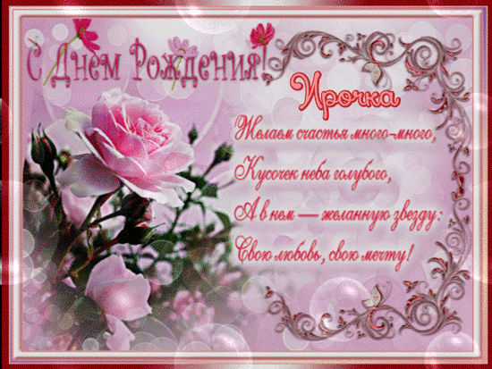 |  Ириша, поздравляю тебя с днем рождения! Пусть в твоей жизни Будет много счастливых событий, приятных впечатлений, хороших и верных друзей, стихов и музыки, что отзываются в сердце, слов искренних, чувств ярких, светлых и истинных, здоровья, мира, благополучия и гармонии в душе, и пусть каждый день твоей жизни будет наполнен волшебством и магией добра!  Накрытый скатертью стоит шикарный стол, На нем закусок море, торт, варенье, Какой сегодня праздник? В чем прикол? Да ведь у Ирочки сегодня день рождения! Включите музыку погромче, чтоб у нас Волна веселья, как опара, поднималась, Чтоб нашу Ирочку поздравить в этот час, И пожелать, чтоб все желания исполнялись!