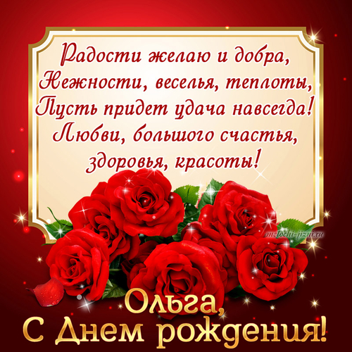 | Дорогая Олечка, Поздравляю тебя с днём рождения! Желаю тебе крепкого здоровья, безграничного счастья и исполнения всех заветных мечтаний. Пусть каждый день приносит радость, новые возможности и приятные сюрпризы. Ты — удивительный человек, и мир стал бы лучше, если бы в нём было больше таких, как ты. Пусть твоя жизнь будет наполнена любовью, успехом и гармонией. Счастья тебе, благополучия и много-много радостных моментов! С любовью и уважением, Юлиана.